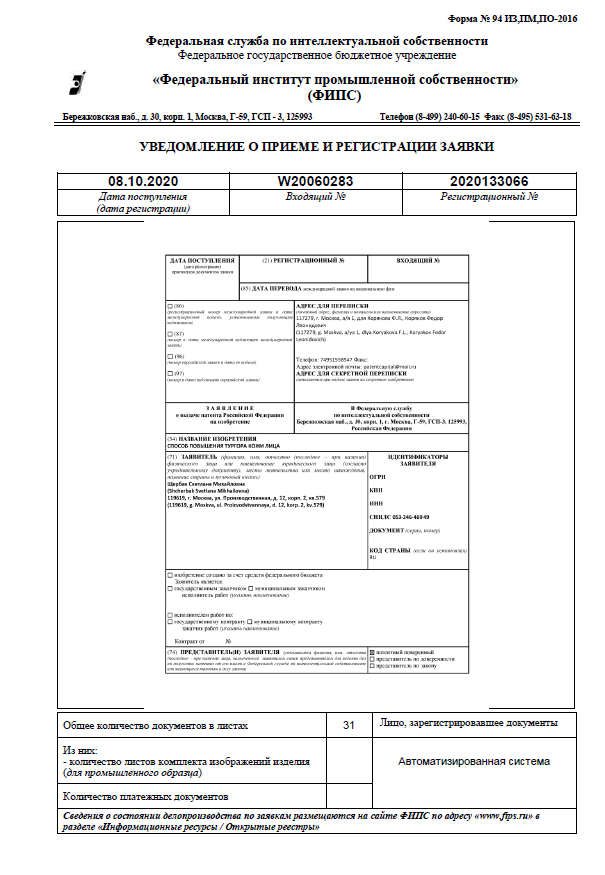 Дорогие друзья! Рада сообщить, что разработанная мной авторская методика "СПОСОБ ПОВЫШЕНИЯ ТУРГОРА КОЖИ ЛИЦА" успешно прошла испытания и претендует на предоставление правовой защиты, в связи с чем 08.10.2020 в Федеральную службу по интеллектуальной собственности (Роспатент) была подана заявка на выдачу патента на изобретение.
